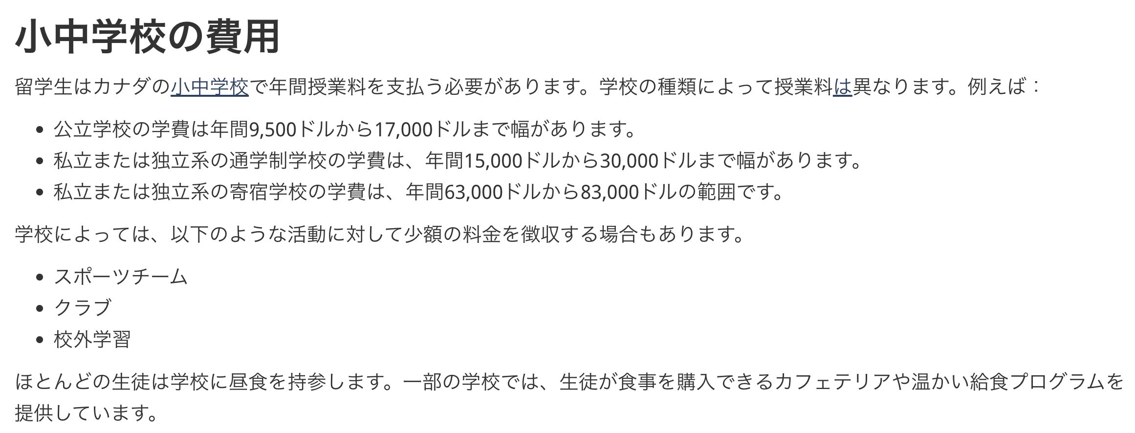 - 私立デイスクール:年間15,000〜30,000カナダドル程度