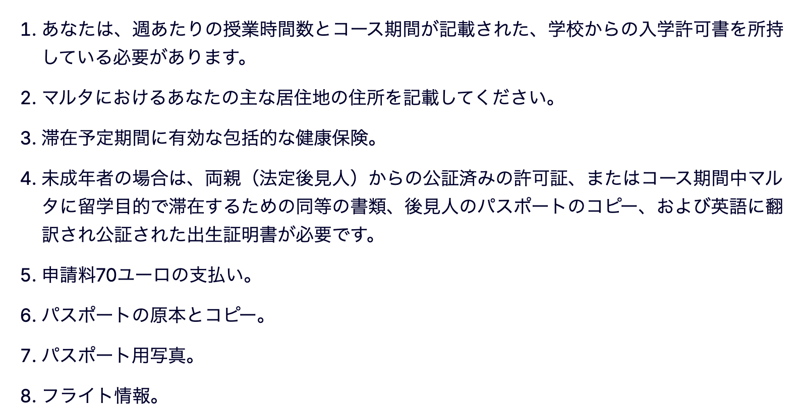 未成年者の滞在については、EUの移民ポータルでも、未成年の場合は両親または法的保護者による公証付きの許可書などが必要と案内されています。つまり、リゾート感のある国だからといって手続きが軽いわけではなく、未成年の渡航・就学にはしっかりした書類準備が必要です。